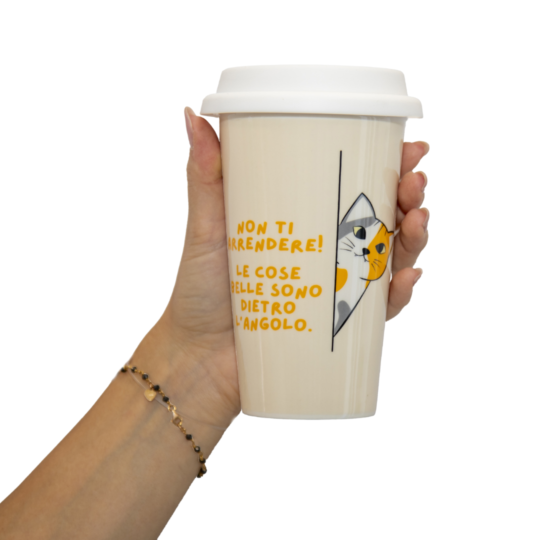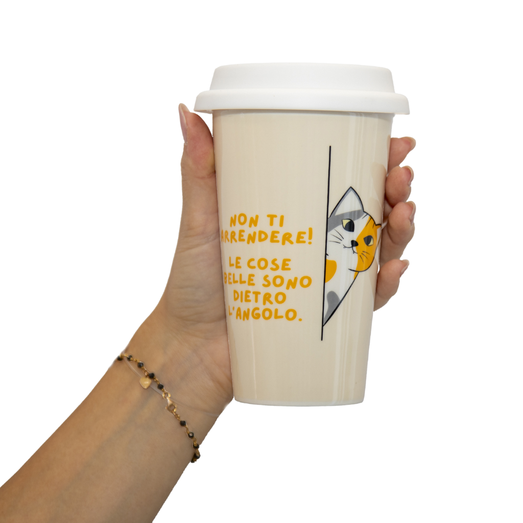 Una tazza che unisce dolcezza e determinazione! Con la scritta "Non ti arrendere, le cose belle sono dietro l'angolo" e l'adorabile immagine di un gatto che spunta curioso da una fessura, questa tazza in ceramica ti ricorda che anche nei momenti difficili c'è sempre una sorpresa felina pronta a farti sorridere.
